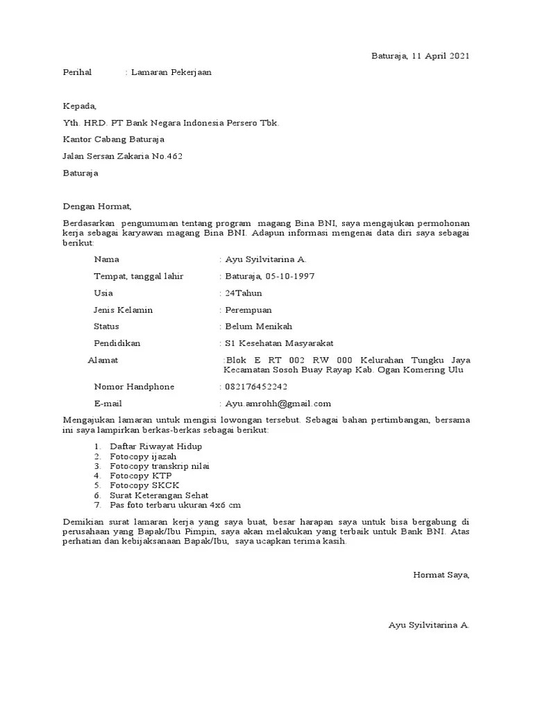 Surat Lamaran Bina Bni / Loker Karanganyar Loker Bank Bni Dokumen Yang Dibutuhkan Surat Lamaran Daftar Riwayat Hidup Foto Berwarna Terbaru Seluruh Tubuh Depan Dan Samping Setengah Badan Merapatkan Skck - Mungkin anda masih belum tau apa saja tahapannya, pada umumnya yaitu:. Surat lamaran dan daftar riwayat hidup. Surat lamaran bina bni ilmusosial id. Dibawah ini telah kami sajikan artikel yang berkaitan dengan contoh surat lamaran bina magang bni lulusan smk sma d1 d2 d3 s1 s2 dari berbagai . Bina bni wilayah 06 · surat lamaran · curriculum vitae · ijazah terakhir · pas foto 4×6 berwarna 4 lembar · foto weluruh badan ukaraj 3r 1 lembar . Contoh surat lamaran bina bni contoh surat lamaran kerja bank bni sebagai teller resep ku ini.